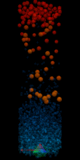 | lavalampen- simulation* 2007 | OpenGL; 3D-Graphics; Molecular simulation; Particle simulation; Physics; Dynamics; xgas | Linux; OpenGL | C++ | This program shows a model of a LavaLamp at molecular level in OpenGL 3D graphics. It begins with molecules of water and wax (blue and red, different sizes). Brownian movement makes them "fly" around in the (simplified cylindrical, not lozenge shaped yet) LavaLamp container. If they hit the walls or another molecule, some energy and impulse may be exchanged - or they may show a tendency to stick together. Molecules are heated at the bottom of the container, and change colour, size, speed, and lift (which may be a result of other parameters, and which adds simplification with regard to required number of molecules to "fill" the container and lowers required observation time, but also adds "incorrectness" with regard to physics). All parameters are adjustable and one can see how the model reacts to such adjustments. The sequence of images to the right shows a working model of a non-working Lava-Lamp: It starts with a random distribution of "water" and "wax" of equal temperature. Then, the water molecules are too few, or too cold, to fill the container equally at this gravity level - they sink down. After some time, the wax molecules get warmer (from red to orange) and go upwards. They also start globbing a bit. The water molecules also get warmer at the bottom (light blue, more movement), but after a while, water and wax are clearly separate, so something went wrong for the LavaLamp with the settings chosen here. Nevertheless, it's already relaxing to watch the little molecules move around :-) | ||