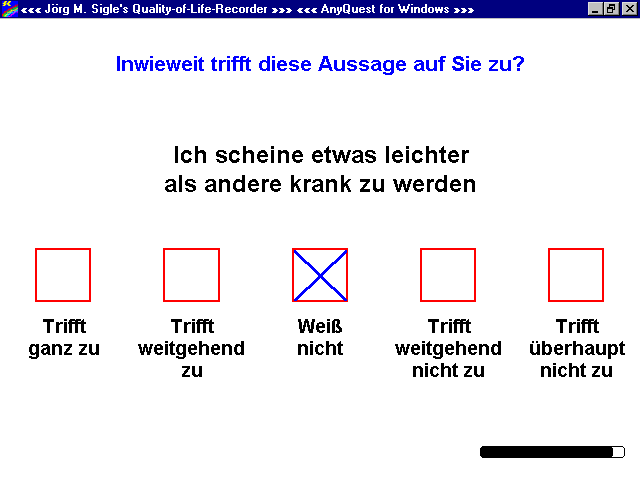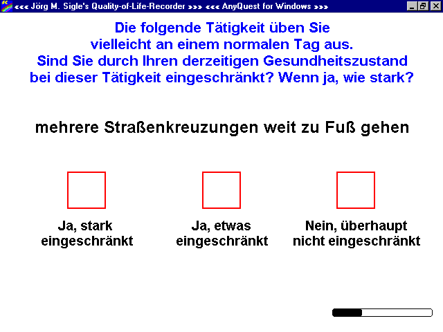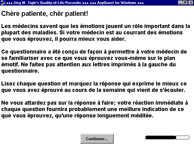 Sie können entweder von hier aus nach unten scrollen, oder das Menü links verwenden, um zu einem bestimmten Abschnitt zu springen Hinweis: Texte sind in der Übersicht möglicherweise schlecht lesbar. Sie können jedoch auf jedes Bild klicken, um es zu vergrößern. Hinweis: Eine große Auswahl von Bildschirmfotos, die fast alle Anzeigen während der Installation, Anpassung und Benutzung eines vordefinierten Pakets mit einer bestimmten Auswahl von Fragebögen zeigt, finden Sie in den eSIRO Manuals, die als PDFs auf der Seite Docs+Support liegen. Hinweis: Falls der Internet Explorer (wie z.B. die hier vorliegende Version 6.0.2800.1106IS) die Tabellen mit den Bildschirmabzügen zu breit darstellt, kann ein Umstieg auf Mozilla (wie z.B. Version 1.7.12) eventuell eine angenehmere Darstellung liefern. Und (verglichen mit I.E. 8, Mozilla 1.x, Mozilla 3.5, konqueror) Apple's Safari könnte der Browser sein, der verkleinerte Bildschirmabzüge am schönsten darstellt. Darstellung von Fragebögen auf dem LQ-RecorderWenn Sie ähnliche Fragebögen auf dem LQ-Recorder verwenden möchten, finden Sie alles Notwendige in der Software-Bibliothek. Um die abgebildeten Beispiele in hoher Auflösung zu betrachten, klicken Sie jeweils auf das dargestellte Bild. Erstellen und Bearbeiten von Fragebogen-Definitions-Dateien und KonfigurationenUm die abgebildeten Beispiele in hoher Auflösung zu betrachten, klicken Sie jeweils auf das dargestellte Bild.