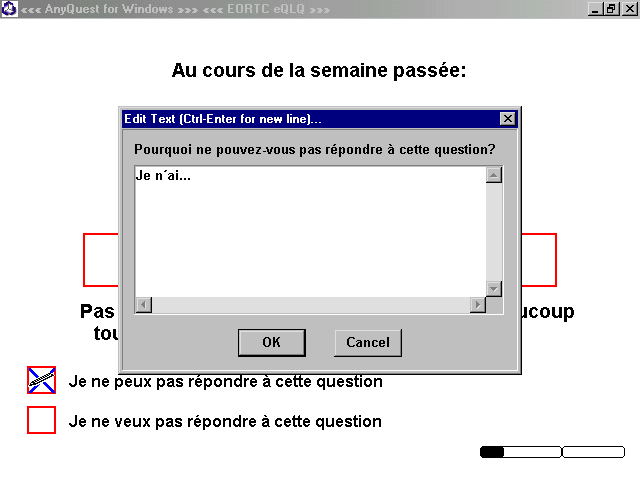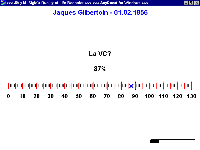 Eine erste Unterstützung für diese Aufgabe wurde in 2006 hinzugefügt, und zwar tatsächlich aufgrund der Erfordernisse einer Validierungsstudie. Die hier vorhandene Funktionalität ist jedoch bisher weniger umfangreich als diejenige in AnyQuest's bevorzugten Arbeitsmodus. Weitere Details über diesen Arbeitsmodus einschließlich Bildschirmfotos finden Sie in den eSIRO Manuals, welche als PDFs auf der Seite Docs+Support liegen. Bitte folgen Sie diesem Link zur Seite mit Beispielen von Ausdrucken... |